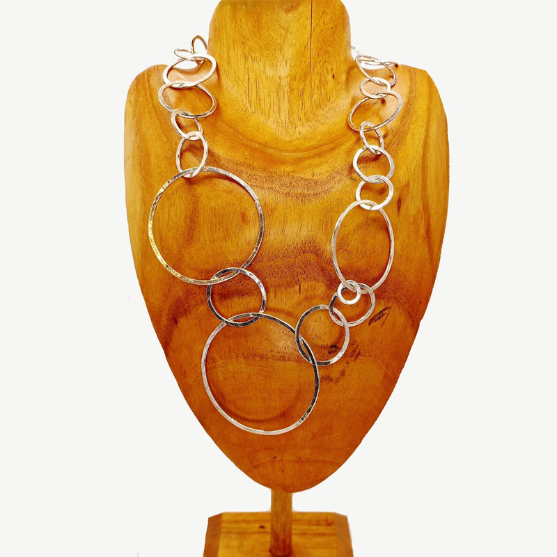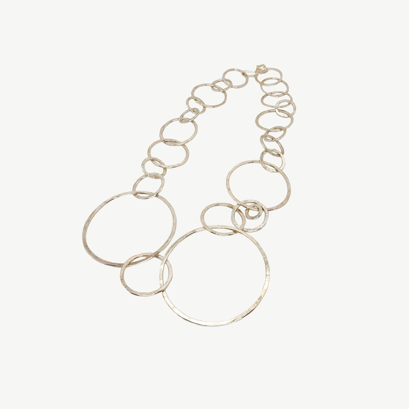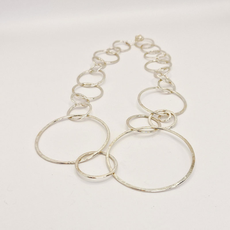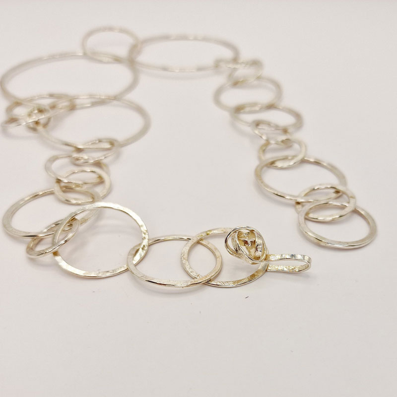 Sterling Silver interlocking hooped Necklace. Set with our Unique flower clasp. Elegant for special occasions and perfect for everyday where. Handmade in our London Workshop